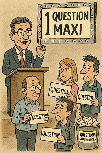 Le journaliste lève la main, pose sa question… et soudain, une autre interrogation lui traverse l’esprit. Trop tard ! Le chrono est écoulé, le micro s’évapore comme dans un jeu télévisé.