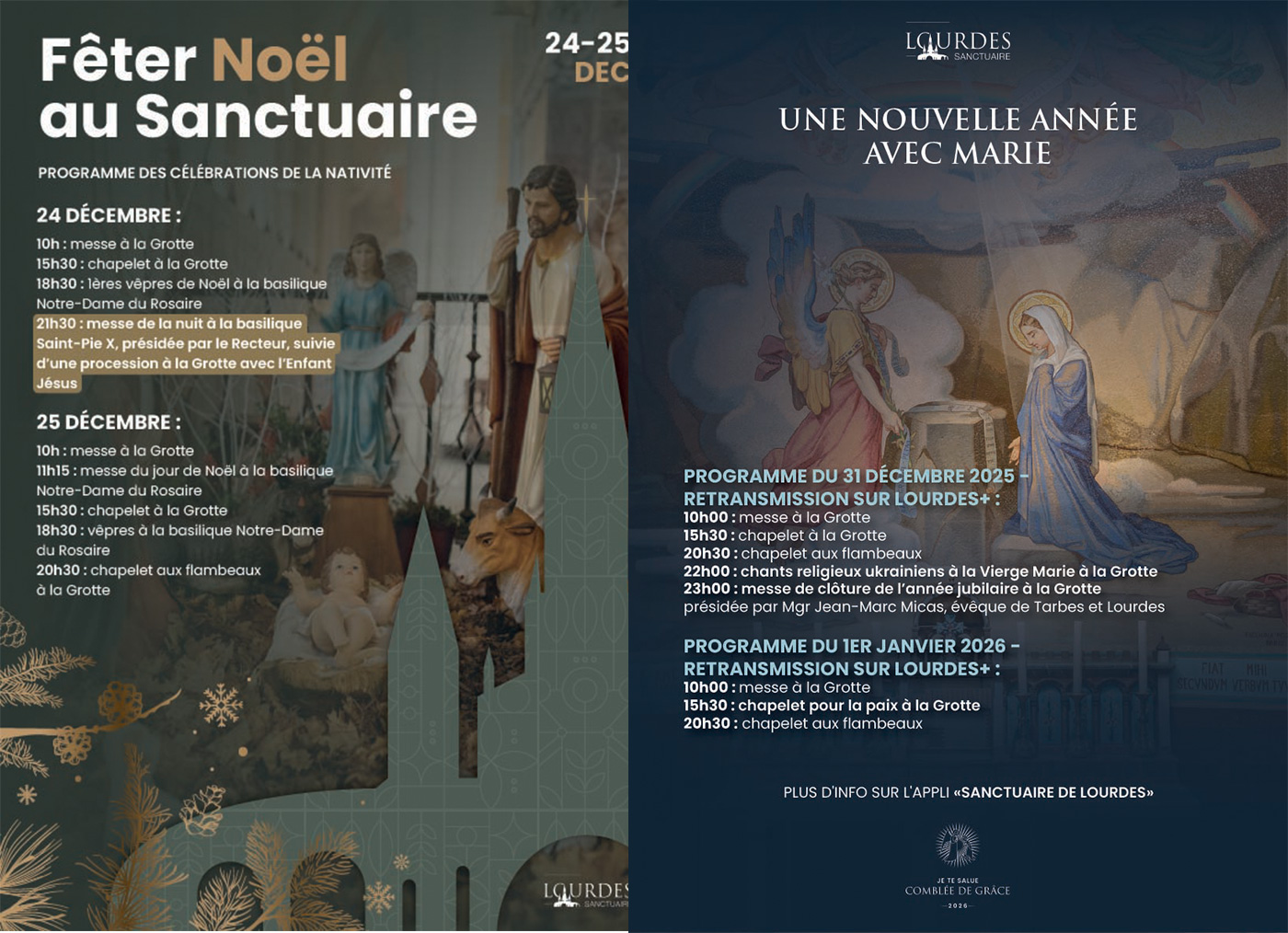 Selon le programme partagé par le Sanctuaire, les célébrations de Noël s’inscrivent dans la continuité des temps forts proposés chaque année : messes à la Grotte, vêpres, chapelets, veillées et processions, dans un cadre où la grande crèche et les illuminations accompagnent les pas des visiteurs.