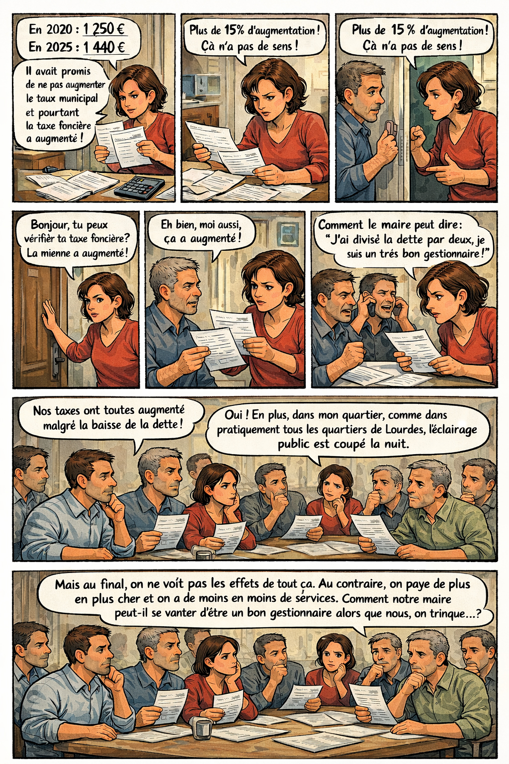 Notre dernière bande dessinée. illustre ce malaise avec justesse : des habitants qui comparent leurs feuilles d’impôts et se demandent où passe leur argent. Ils sont perplexes, frustrés, en colère. Et ils ont raison.