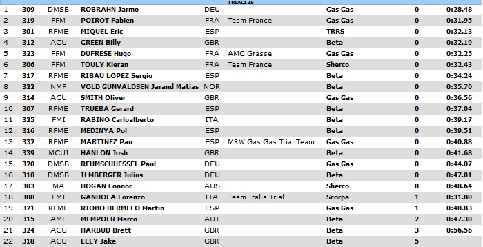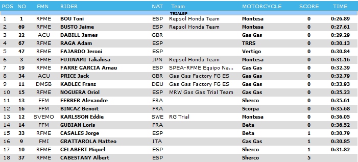 On s’y attendait, les Espagnols ont pris les premières places. Dans le Top 5, on en trouve 4 dont le grand favori Toni Bou qui s’est révélé le meilleur devant son compatriote Jaime Busto. Adam Raga et Jeroni Fajardo prennent les 4e et 5e places. Seul le Britannique James Dabill est venu se glisser à la 3e place. Le premier Français est Alexandre Ferrer (11e). Il devance le tricolore Benoît Bincaz (12e). Loris Gubian est 14ème.