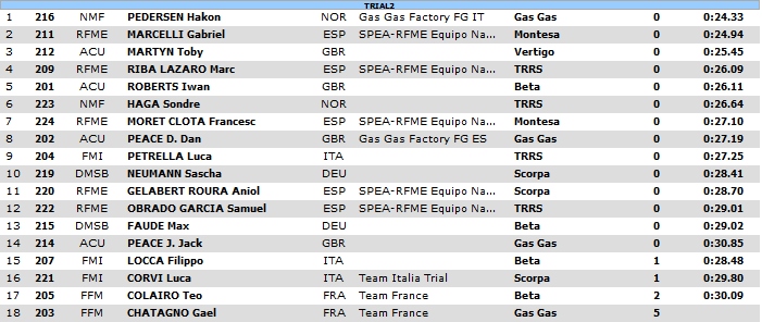En trial 2, domination du Norvégien Hakon Pedersen, devant l’Espagnol Gabriel Marcelli et le Britannique Toby Martin. Le premier Français Teo Colairo est 17e. Gaël Chatagno, l’une des chances françaises partira en 18e position.