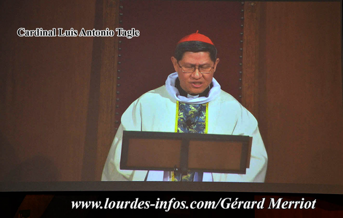 Comme tous les ans, les pèlerins sont venus nombreux fêter Notre-Dame de Lourdes mais aussi le 161ème anniversaire des apparitions et la 27ème journée des malades. Près de 12 000 pèlerins ont assisté ce lundi matin à la basilique Saint-Pie X à la messe internationale présidée par le cardinal Tagle, archevêque de Manille et très proche du pape François. Plusieurs évêques dont Mgr Nicolas Brouwet, évêque du diocèse de Tarbes et Lourdes, 400 prêtres ont concélébré l’office. Les pèlerins italiens étaient sans doute les plus nombreux au moment où Mgr Brouwet a accueilli le Cardinal Tagle : “Merci de votre présence, de votre prière pour célébrer avec nous la fête de Notre-Dame de Lourdes. Merci de représenter aussi notre cher pape François. Comme cardinal, vous êtes l’un de ses proches collaborateurs. Nous vous disons toute notre communion avec lui”.