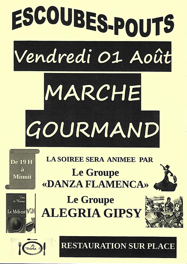 Le vendredi 1er août, le paisible village d’Escoubès-Pouts se transformera en une scène vibrante d’émotions et de saveurs. Dès 19h, le « Marché Gourmand » ouvrira ses portes pour une soirée placée sous le signe de la fête, de la convivialité et des traditions.