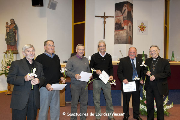 – Ils ont eu l’honneur de recevoir la médaille du mérite diocésain des mains de Monseigneur Jacques Perrier, évêque de Tarbes et Lourdes (de gauche à droite sur la photo ci-dessous) : Robert Peres, René Lesponne, René Ricaud, Jean-Claude Mengelle et Jean-Pierre Passard.