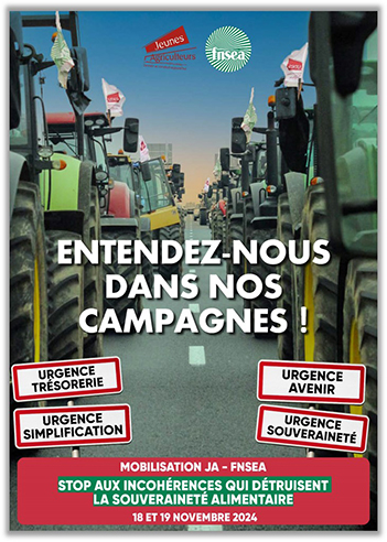 Depuis des mois, Jeunes Agriculteurs et la FNSEA alertent sur la crise agricole profonde que traverse la France. Malgré quelques avancées, les mesures prises par le gouvernement sont jugées insuffisantes. L’été et l’automne 2024 ont été marqués par une grave crise sanitaire et des récoltes catastrophiques dues aux conditions climatiques. De plus, la signature imminente de l’accord Mercosur et les rétorsions chinoises aggravent la situation. Pour se faire entendre, une mobilisation nationale est prévue du 17 au 19 novembre 2024, avec des "feux de la colère" allumés simultanément dans tous les départements de France. Les agriculteurs dénonceront également la lourdeur administrative et les surtranspositions de lois, en attendant des mesures de simplification promises. (...)