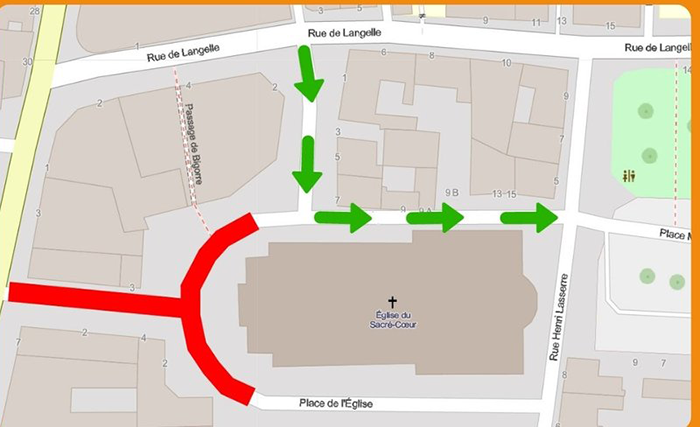 Les riverains qui habitent du n°11 au n°15 de la rue de la place de l’Église seront autorisés à accéder à leur domicile par la rue Henri Lasserre.