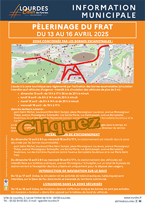11 avril 2025, par rédactionLe pèlerinage du FRAT à Lourdes, se déroulant du 13 au 16 avril 2025, entraîne des mesures particulières de sécurité et de circulation. L’accès à la zone touristique sera réglementé par des bornes escamotables, interdisant la circulation des véhicules, sauf pour les urgences, à divers moments durant cet événement. Le stationnement sera également strictement prohibé dans les zones touchées, notamment le pont Saint Michel et l’avenue Monseigneur Schoepfer. De plus, des restrictions sur la navigation seront appliquées sur le Gave de Pau du 13 au 17 avril.