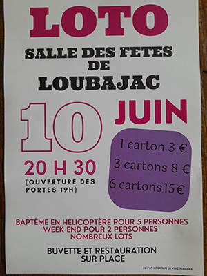 Le comité des fête de Loubajac a à coeur de dynamiser son village. Aussi, nous proposons un loto afin de réunir toutes les générations pour un moment convivial et festif qui aura lieu le samedi 10 juin prochain à 20 h 30 à la salle des fêtes de Loubajac.