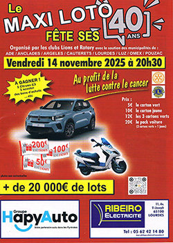 Ce vendredi 14 novembre à 20h30, Lourdes vibrera au rythme du Maxi Loto solidaire, organisé par le Lions Club et le Rotary Club de Lourdes, avec le soutien de plusieurs communes du Pays de Lourdes et de l’arrondissement. Un événement festif, mais surtout porteur d’un message fort : jouer pour aider, miser pour espérer, gagner pour guérir.