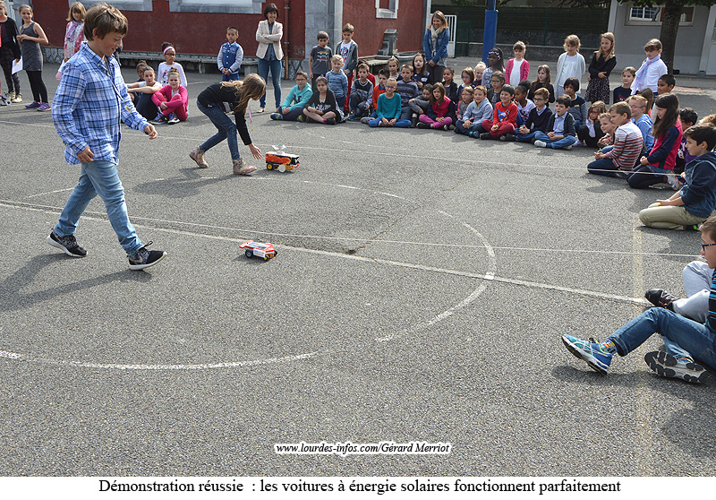 Le premier rendez-vous rendant compte des projets aboutis a eu lieu à l’école Honoré Auzon, laquelle avec ses deux classes de CM2 et une classe de CM1-CM2 a participé aux « Défis solaires ». Les élèves devaient, à partir de cellules solaires, d’un condensateur et d’un moteur électrique fournis, concevoir et réaliser un petit véhicule se déplaçant uniquement grâce à l’énergie solaire. Ces défis solaires existent depuis l’année scolaire 2010/2011 dans les Hautes-Pyrénées. Le 12 mai dernier, les élèves des trois classes de l’école Honoré Auzon ont présenté 6 voitures. Au total, 19 petites voitures étaient présentées, représentant une dizaine de classes du département. Deux véhicules réalisés par les élèves de Honoré Auzon sont montés sur le podium, raflant les 1ère et 3ème places.