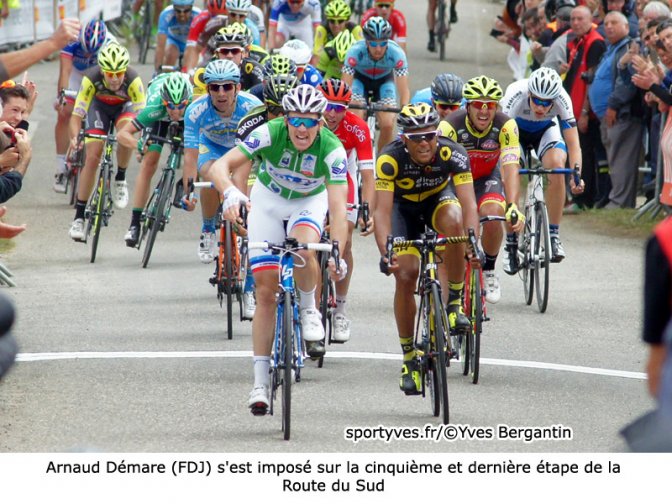 Deuxième sur la première étape de la Route du Sud derrière Bryan Coquard, Arnaud Démare (FDJ) a remporté dimanche le sprint de la dernière étape où il a levé les bras devant Yohann Gène (Direct Energie) et Stéphane Poulhies (Armée de Terre). Il s’est emparé s’est ainsi emparé du maillot vert.