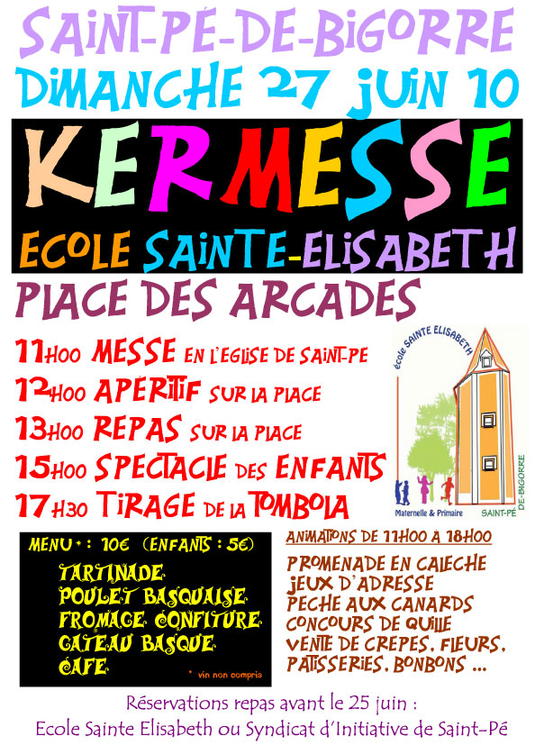 La traditionnelle kermesse de l’école Sainte-Elisabeth se déroulera dimanche 27 juin 2010, de 11h00 à 18h00, sur la place des arcades. Au programme : 11h00 messe en l’église de Saint-Pé, 12h00 apéritif servi sur la place, 13h00 repas : tartinade, poulet basquaise, fromage et sa confiture, dessert (10€ pour les adultes – 5€ pour les enfants), 15h00 spectacle des enfants, 17h30 tirage de la tombola. Des stands de jeux accueilleront grands et petits toute la journée. Promenade en calèche, jeux d’adresse, concours de quille, fleurs, crêpes et gâteaux… seront au rendez-vous. Afin de faciliter l’organisation du repas, merci de vous inscrire avant le 25 juin soit à l’école, soit au syndicat d’initiative de Saint-Pé.