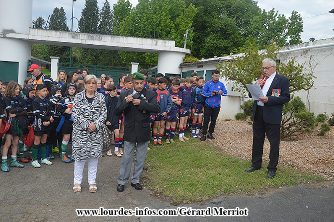 David Parrou, président de l’École de Rugby du Pays de Lourdes, accompagné de Mohamed Dilmi, adjoint au maire de Lourdes, chargé de la jeunesse et des sports, et deux jeunes joueurs, a déposé une gerbe en signe de respect. Puis, Thierry Lavit, maire de Lourdes, et Bruno Horta, président du FCL XV, ont déposé à leur tour une gerbe pour la municipalité, accompagnés de Jean-Pierre Garuet et de deux jeunes joueurs du FCL. La mémoire des résistants du club a été honorée avec l’appel de leurs noms par un jeune rugbyman, auquel l’assemblée répondait solennellement : « Mort pour la France ».