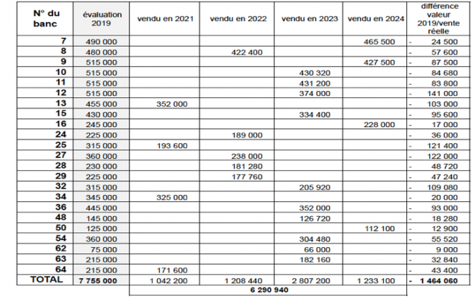 Car on voit que sur plus d’une vingtaine de ventes (heureusement qu’il était contre la vente des bancs …), on dénombre 1,5 M de moins-value par rapport à la valeur estimée en 2019 par les Domaines.