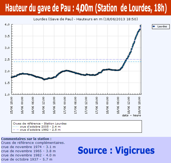 La crue du gave de Pau est encore plus importante que celle survenue les 20 et 21 octobre 2012. Le secteur hôtelier (avenue du Paradis, avenue dPeyramale, rue de la Grotte, esplanade du Paradis, quai Saint-Jean) est confronté à des inondations et à des coupures d’électricité. Les interventions des pompiers sont très nombreuses. La grotte est noyée. Rien d’étonnant quand on constate qu’à 18h, la hauteur d’eau mesurée à la station de Lourdes était de 4m contre 2,50m en 1982, qui constituait la crue de référence pour la dite station. Il faut se souvenir que lors de la crue centennale de 1937, le gave avait atteint 5,70m.