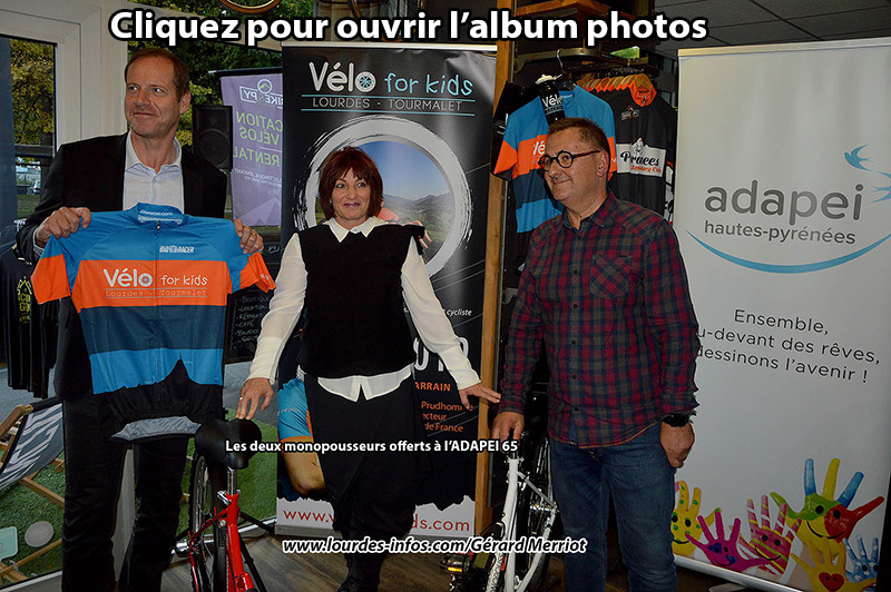 18 octobre 2019, par rédactionAprès s’être déplacé à Loudenvielle, où arrivera la 8ème étape du Tour de France 2020, Christian Prudhomme, le directeur de la plus grande course cycliste du monde, a réservé hier soir la surprise aux personnes présentes à la boutique Bike & Py, 16 avenue du Paradis, venues assister à la remise de deux monopousseurs à l’ADAPEI 65 représentée par sa présidente Evelyne Lucotte-Rougier. Parrain de l’association Velo For Kids, co-présidée par Mgr Xavier d’Arodes, recteur adjoint du sanctuaire ND de Lourdes et de l’hôtelier lourdais Bernard Wagner, Christian Prudhomme n’était pas attendu. Inutile de dire l’honneur qu’a ressenti la nombreuse équipe de bénévoles qui constitue l’association quand ils l’ont vu arriver en compagnie de Michel Pélieu, président du conseil départemental.(...)