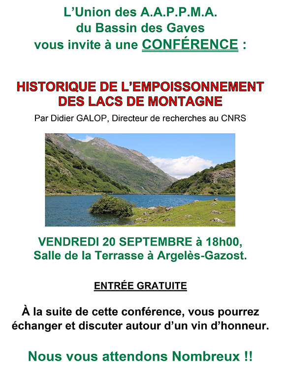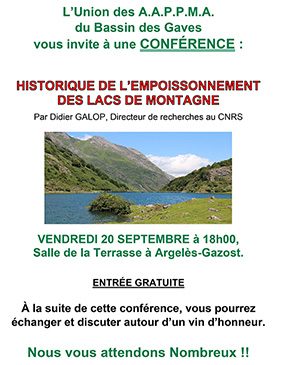 16 septembre 2019, par rédactionL’union des Association Agréé de Pêche et de protection du Milieu Aquatique organise le Vendredi 20 Septembre à 18 heures salle de la terrasse à Argelès-Gazost une conférence. Le thème portera sur l’historique de l’alevinage des lacs de montagnes.
