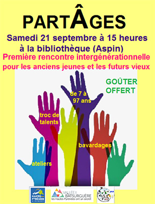 Le samedi 21 septembre à partir de 14h30, la médiathèque de Batsurguère invite les "anciens jeunes et les futurs vieux" à une première rencontre intergénérationnelle. Nous espérons mettre en place un beau projet d’échanges et de partages. Le goûter sera offert. (de 7 à 97 ans)