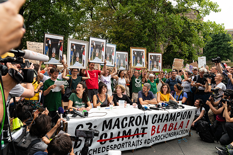 25 août 2019, par rédactionBayonne, dimanche 25 août. La « marche des portraits » pour le climat a réuni plus de 900 personnes au cœur de la ville malgré l’interdiction de manifestation liée à la tenue du G7 à Biarritz. A 10h00 du matin, des portraits officiels du président Macron réquisitionnés dans tout l’Hexagone et recherchés par les forces de police et de gendarmerie de toute la France ont surgi dans le centre ancien de Bayonne. Une conférence de presse a dressé un bilan sévère de la politique climat du gouvernement Macron, et a dénoncé le fossé immense entre ses discours internationaux sur le climat et ses décisions concrètes en France. Un grand nombre de journalistes, dont beaucoup de médias étrangers, ont couvert la marche et la conférence de presse donnée par plusieurs personnalités et spécialistes du climat. Bizi et ANV-COP21 ont en outre réussi une seconde action à Espelette, village basque visité ce même dimanche par les conjointes des 7 chefs d’Etat.