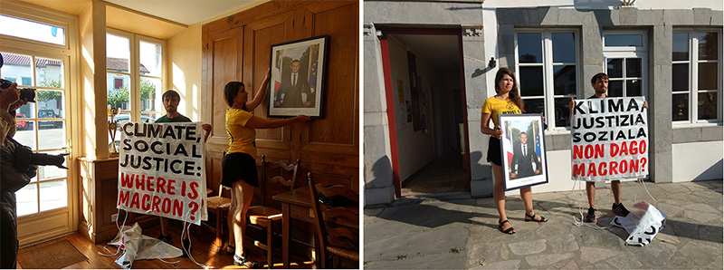 Véritable pied de nez à la veille du G7, ce nouveau décrochage, le 12e au Pays basque, intervient pour casser l’image de leader climatique que Macron entend construire à l’international. Brandissant des banderoles où l’on pouvait lire en français, anglais et basque : "Climat, justice sociale : où est Macron ?", les militants sont entrés dans la Mairie d’Irissarry et en sont repartis avec le portrait, portant à 128 le nombre de portraits réquisitionnés dans tous l’Hexagone depuis le mois de février, le premier l’ayant été à la mairie de ... Biarritz.(...)