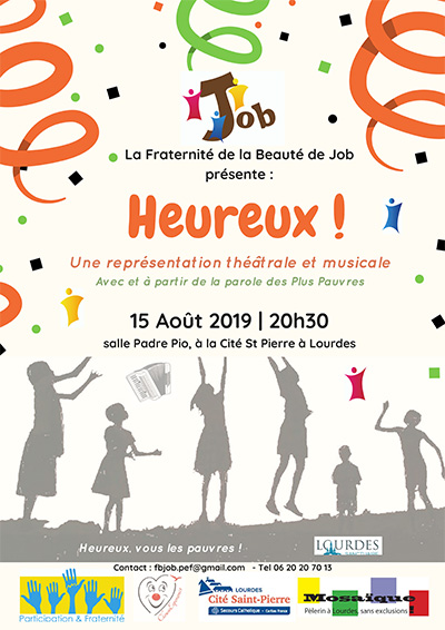 La représentation théâtrale et musicale « Heureux ! », réalisée par la Fraternité de la Beauté de Job, sera présentée le 15 aout à la Cité Saint-Pierre à la salle Padre Pio à 20h30. Les spectateurs repartiront changés dans leur regard sur les pauvres et sur la vie de foi des plus pauvres.(...)