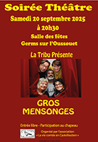 L’Association « La Vie Contée en Castelloubon » organise le samedi 20 septembre prochain à 20h30, salle des fêtes de Germs sous l’Oussouet une soirée théâtre avec la Compagnie LA TRIBU située à Bazet.