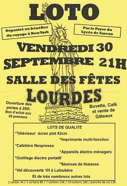 Le Foyer socio-éducatif du Lycée organise un Loto le samedi 17 octobre à 21h au gymnase de la cité scolaire de Sarsan afin d’aider à financer un voyage à New York pour les élèves de Terminale L / ES / STL. Dans le cadre de ce voyage, 43 élèves et leurs 5 accompagnateurs vont découvrir pendant 6 jours quelques unes des multiples facettes de cette ville fascinante, déjà visitée dans des conditions semblables en 2002 et 2004 par les élèves du Lycée.