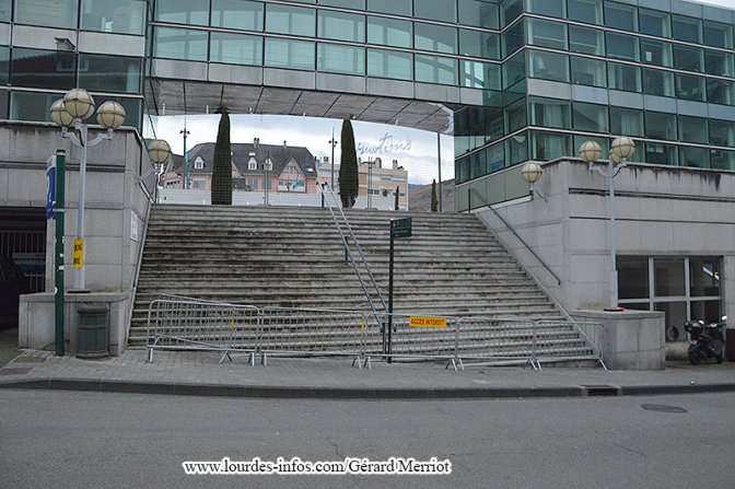 J’ai donc décidé à compter de ce jour la fermeture provisoire de la place Peyramale. Le barriérage de la place est en cours et nous avons procédé, dès cette après-midi, avec le 1er adjoint, Alain Garrot, au relogement de l’Office de Tourisme. Un accueil du public sera provisoirement mis en place à l’espace jacquaire, au plus proche de nos visiteurs, et la partie bureaux devrait être installée dans des bâtiments municipaux.