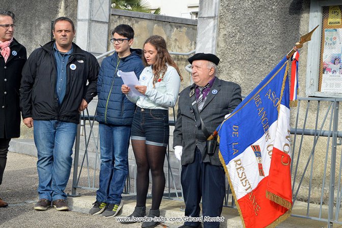 La gerbe a été déposée par les deux conseillers départementaux Adeline Ayéla et José Marthe, entourés de deux enfants du village Chloé Durand, 14 ans et Alexis Durand, 12 ans.