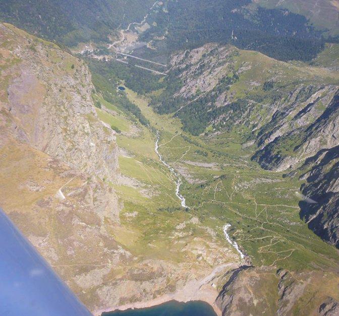 Ce lac d’environ 50 hectares qui se remplit en hiver peut s’abaisser de 20 mètres dès l’été au profit des cours d’eau de la vallée de l’Adour et de ses canaux dérivés. On voit sur ce cliché récent de fin août, les eaux libérées qui dégringolent vers la vallée du Chiroulet ainsi que la trace de l’abaissement du niveau des plus hautes eaux.