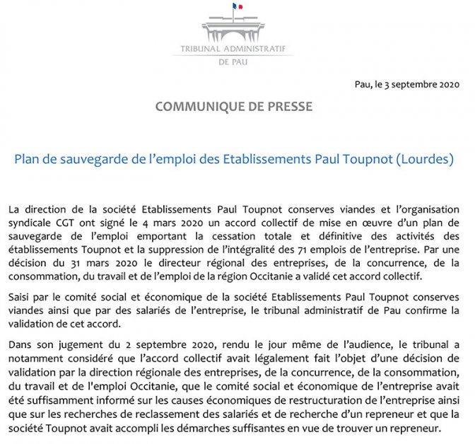 Ci-dessous nous mettons en ligne le communiqué de presse relatif au jugement rendu le 2 septembre 2020 par le tribunal administratif de Pau, sur le recours dirigé contre la validation de l’accord collectif de mise en oeuvre d’un plan de sauvegarde de l’emploi emportant la cessation totale et définitive des activités des établissements Toupnot à Lourdes, et la suppression de l’intégralité des 71 emplois de l’entreprise.