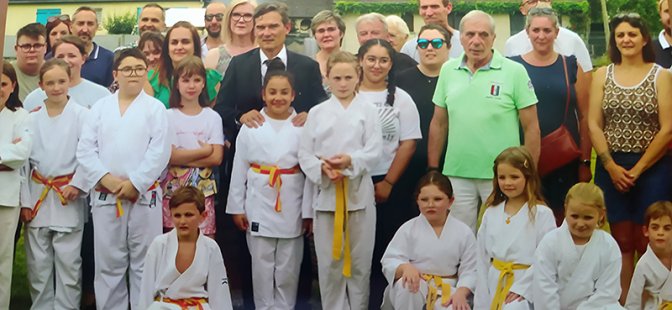 Le maire a remis la ceinture noire à Anaé De Souza qui bien sûr était très émue, ainsi qu’aux enfants très heureux de recevoir leurs nouvelles ceintures. Ensuite la surprise fut pour Firmin qui ne s’attendait pas de recevoir un superbe karategi, arrivé directement du Japon. Il a remercié particulièrement Nadine la trésorière et l’ensemble du club pour ce merveilleux cadeau.