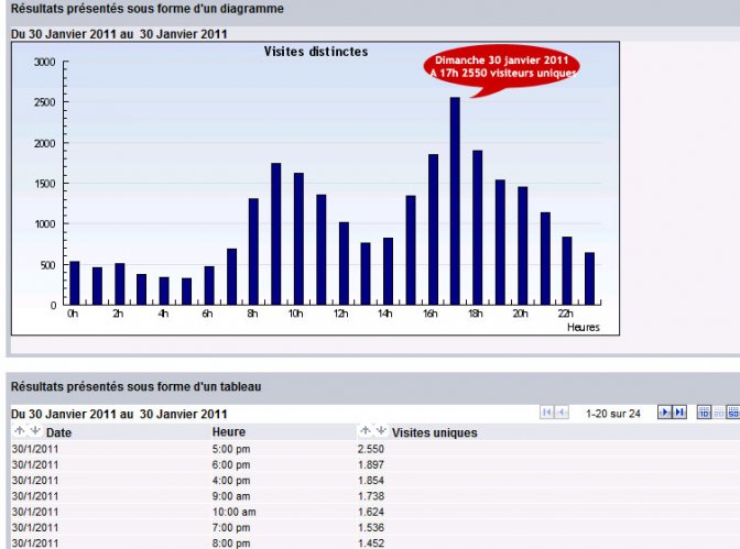 Comme nous le faisons habituellement, nous afficherons demain les statistiques concernant le mois de janvier 2011. Aujourd’hui, elles traduisent toujours une progression puisque au 30 janvier 2011, la moyenne de visiteurs par jour est de 21 439 !!! Découvrez ci-dessous le graphique de 1&1 Webstats…