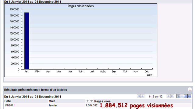• 1 884 512 : c’est le nombre de pages visionnées durant le mois de janvier 2011, ce qui représente une moyenne quotidienne de 60 790 pages.