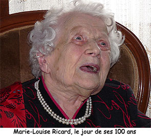 Nous avons appris avec tristesse le décès de Marie-Louise Ricard qui s’est éteinte paisiblement à l’âge de 102 ans. Elle était la mère de notre ami Claude Ricard, bien connu à Lourdes, aujourd’hui retraité après avoir été agent général d’assurances et rédacteur en chef de l’hebdomadaire « L’Essor Bigourdan ». Le 4 mars 2009, nous étions présent auprès de sa famille et de ses amis lors de son centième anniversaire, dans sa maison familiale à Pierrefitte-Nestalas, commune dont elle était jusqu’alors la doyenne. Ses obsèques seront célébrées, le vendredi 4 février 2011, à 14h30, en l’église de Pierrefitte-Nestalas. Nous présentons à son fils Claude, à sa belle-fille, le docteur Anne Ricard-Sans, et à sa famille nos sincères condoléances.