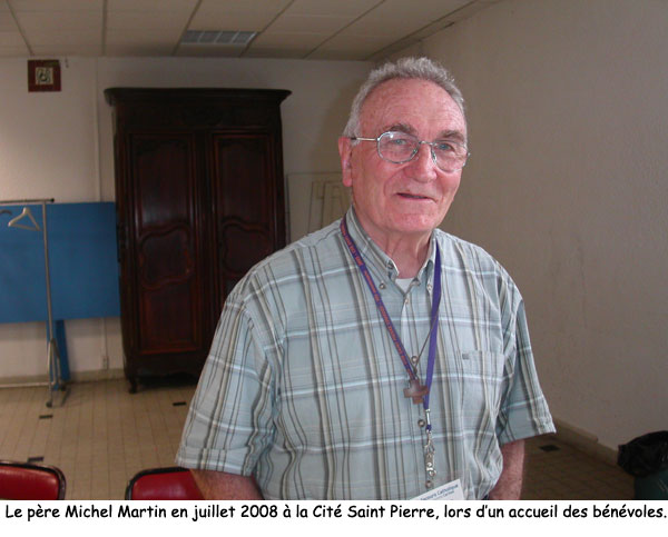 Cuba, le Mexique, la Colombie, les cités de Paris et de Seine-Saint-Denis, puis la Cité Saint Pierre à Lourdes : infatigable voyageur, le père Michel Martin était toujours prêt à partir vers de nouveaux horizons, animé par un zèle missionnaire ardent et par une joie de vivre à toute épreuve. Jeudi 27 janvier 2011, son cœur généreux mais fragile a flanché, une fois de trop. « El Padre Miguel », son surnom à la Cité, a bouclé son sac pour un voyage vers les étoiles. Nul doute qu’il y retrouvera Celui dont la Parole a nourri son existence aventureuse. Ses funérailles ont été célébrées le mercredi 2 février 2011 à Issy-les-Moulineaux dans les Hauts-de-Seine, en présence de la communauté des Fils de la Charité, sa congrégation, des représentants de Pax Christi, dont il fut aumônier national,de ses parents et amis, parmi lesquels plusieurs permanents et bénévoles de la Cité Saint Pierre.