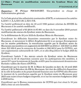 Le procès-verbal du conseil communautaire du 23 juin 2025 apporte un éclairage inédit – et particulièrement révélateur – sur la situation financière de la Ville de Lourdes. Pour la première fois, un document public confirme noir sur blanc que le maire de Lourdes a officiellement reconnu, dans un courrier daté du 10 avril 2025, l’incapacité de la commune à assumer la contribution qui lui était demandée par le Syndicat Mixte du Hautacam pour l’année 2025.