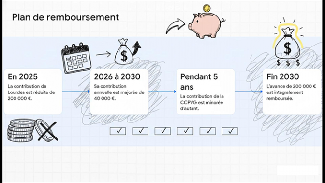 Cette démarche a conduit à une révision statutaire immédiate. Le Syndicat Mixte du Hautacam, puis la Communauté de Communes Pyrénées Vallées des Gaves (CCPVG), ont accepté de transférer une partie de l’effort financier vers la communauté de communes pour l’année 2025. Concrètement, la CCPVG prend à sa charge 200 000 € supplémentaires, tandis que la contribution de Lourdes est allégée d’autant. Un mécanisme inverse – mais beaucoup plus modeste – est prévu pour les années 2026 à 2030.