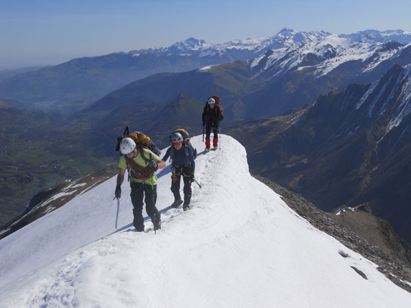 Pas de goulottes ou couloirs car les températures sont trop chaudes ! David Marret (guide de haute-montagne) et Eric Gerardin (instructeur alpinisme FFCAM) ont proposé aux jeunes une longue course d’arêtes : la traversée des Gabizos en 2 jours au départ du col du Soulor.