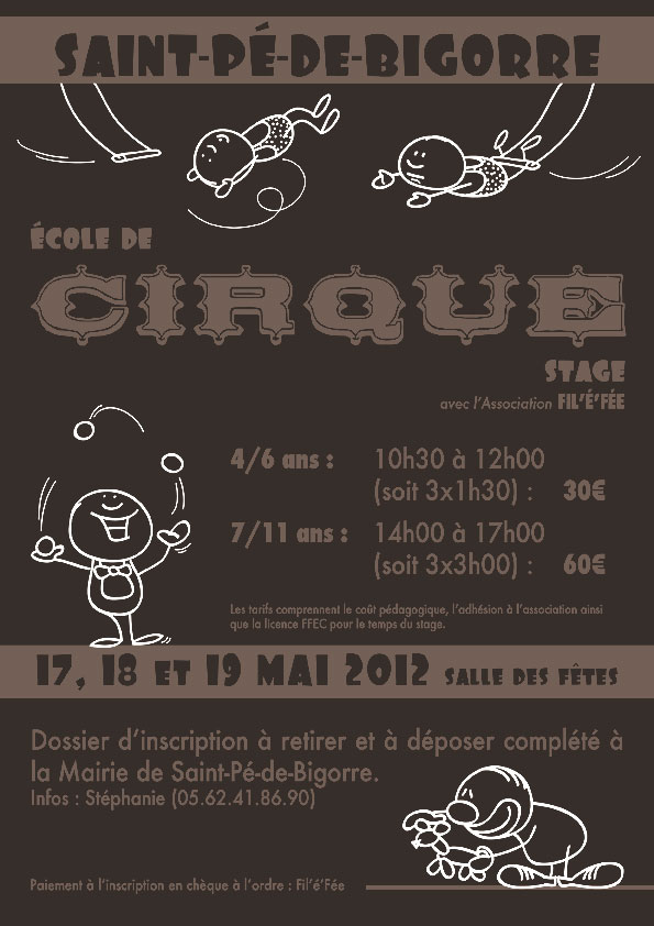 La commission municipale « Culture » a programmé un stage « cirque » les 17, 18 et 19 mai 2012, à la salle des fêtes de Saint-Pé. L’association « Fil’é’fée » animera ce stage qui s’adresse aux 4/6 ans les 3 matinées de 10h30 à 12h00 (30€) et aux 7/11 ans les 3 après-midi de 14h00 à 17h00 (60€). Ce stage de découverte des arts du cirque valorise le climat de respect, de tolérance et vise l’épanouissement personnel à l’écoute du corps. Acrobatie, jonglerie, équilibre, expression clownesque seront au programme de ces 3 jours de stage. Un dossier est à retirer à la mairie de Saint-Pé. Artistes en herbe, venez participer à ce stage !