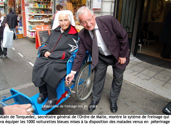 Les voiturettes, ou chariots, de Lourdes sont une copie des moyens de transport utilisés, notamment par l’impératrice Eugénie, dans les stations thermales pyrénéennes du XIXe siècle. A leur conception, les freins semblaient inutiles. En effet, à Lourdes les pèlerins malades sont toujours accompagnés dans leurs déplacements. Seulement aux Sanctuaires rien n’est réellement plat... ni la Grotte, ni l’Esplanade et encore moins la basilique Saint-Pie X. Et pourtant il faut nécessairement savoir immobiliser les voiturettes pour placer un à un les malades au premier rang des célébrations, comme la messe internationale ou les processions. Par le passé, les hospitaliers utilisaient des cales de bois. Plus tard ils croisèrent savamment les timons (ou gouvernails) des voitures pour les bloquer. Aujourd’hui, tout simplement, ils freineront... pour s’arrêter ! Un détail qui change tout...