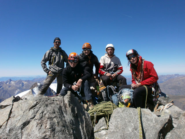 Le premier objectif était l’ascension de voies granitiques semi-équipées dans le massif du Soreiller. Pour cette première partie, 3 copains du groupe espoir Midi-Pyrénées accompagnaient le groupe. C’est donc une colonne de 11 personnes chargées avec tout le matériel d’escalade, de bivouac, et la nourriture pour 3 jours et demi qui a effectué les 1100m de dénivelée jusqu’aux environs du refuge. Plusieurs voies très difficiles ont été gravies en cordées autonomes à l’aiguille Dibona (Madier, Visite obligatoire, sous l’œil d’Andéol, Martine is on the rock) et au Rouget (Version originale). Campant sous la tente, des orages de grêle ont obligé les alpinistes à s’échapper des parois et à redescendre dans la vallée à la Bérarde le 4ème jour. Lucas, Victor et Benoit prenaient alors la route de Chamonix pour rejoindre leur groupe en stage dans le massif du Mont Blanc.