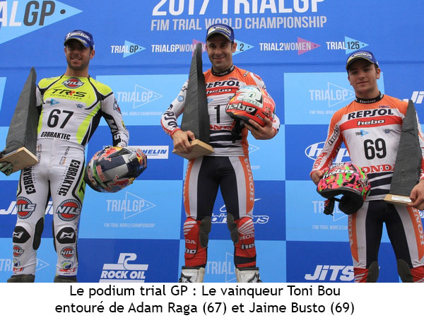 Les qualifications avaient déjà laisser entrevoir la suprématie des pliotes espagnols. Ce dimanche, confirmation au cours de la compétition officielle : en Trial GP, le grand favori Toni Bou s’est imposé devant deux de ses compatriotes : Adam Raga et Jaime Busto. En trial 2, Gabriel Marcelli (Espagne) l’emporte devant Iwan Roberts (Grande Bretagne) et Luca Petrella (Italie). (...)